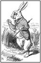 THE WHITE RABBIT ENTERS THE BANK FROM THE OPPOSITE WINGS, MOVING TOWARDS ALICE. RABBIT IS ALL FIDGETY AND IN A RUSH. HE STOPS AND TAKES OUT A POCKET WATCH FROM HIS WAISTCOAT, LOOKING AT IT WITH ALARM.