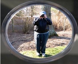BEHIND THE DOOR IS A LARGE CONCAVE MIRROR. THE AUDIENCE SEES ALICE'S REFLECTION SHRUNKEN IN THE MIRROR.